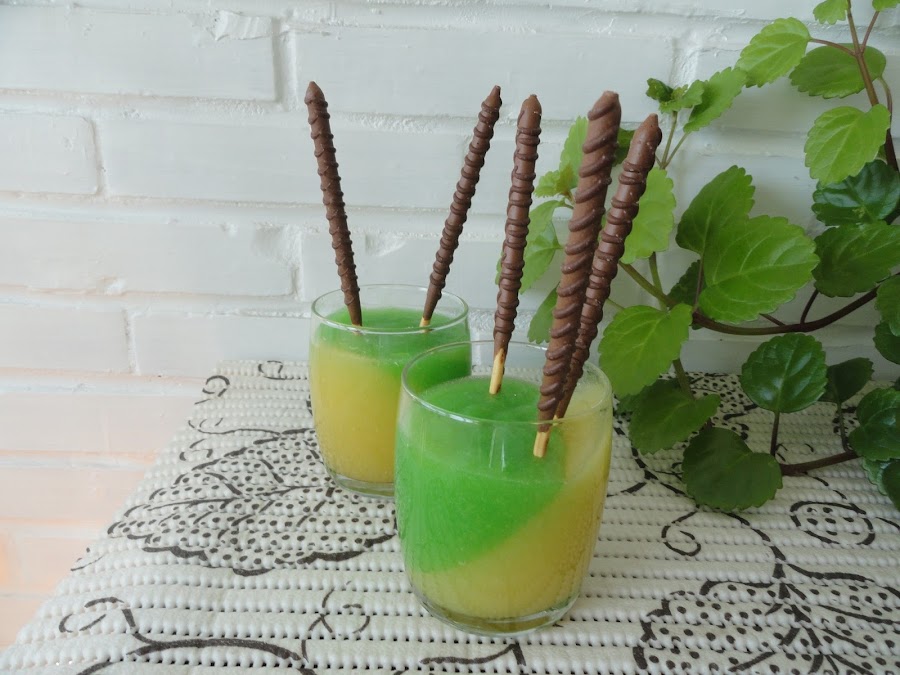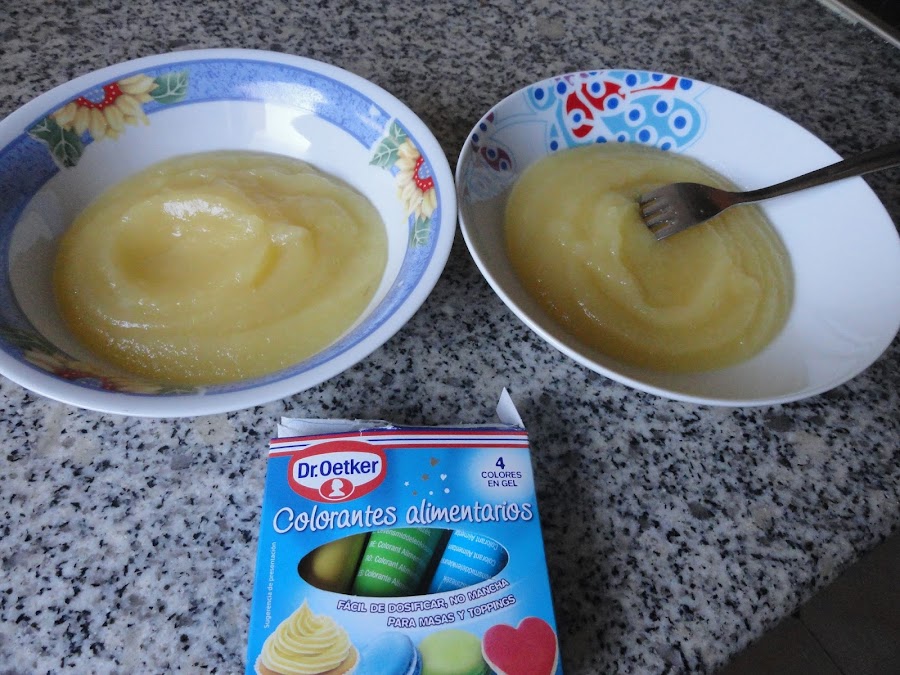 Separamos en dos partes. A la primera le agregamos las dos hojas de gelatina previamente hidratadas en agua fría y ponemos la mezcla en los vasos. Dejamos los vasos tumbados para que se cuajen en la mitad. La otra mitad de la mezcla la reservamos sin la gelatina hasta que la primera cuaje. A esta segunda mitad de la compota le agregamos el color, en este caso al ser la manzana amarillita le he agregado gel azul para conseguir el verde que es lo que pretendía, calentamos un poco en el microondas para que podamos diluir la gelatina . Llenamos el vaso, esta vez ya lo podemos poner de pie y esperamos a que se gelatinice. Los he acompañado con unos palitos de galleta Mikado que venían en mi caja de este mes.
