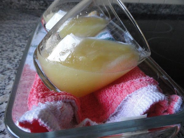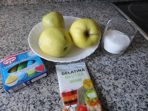 4 hojas de gelatina (una vez cocidas las manzanas las pesamos y dependiendo del peso seguimos las instrucciones del paquete para gelatinizar). En este caso eran unos cuatrocientos gramos una vez cocidas por lo que con cuatro hojas de gelatina fue suficiente.