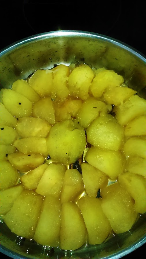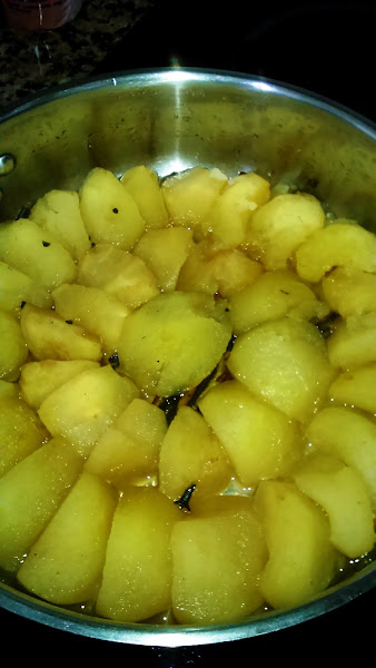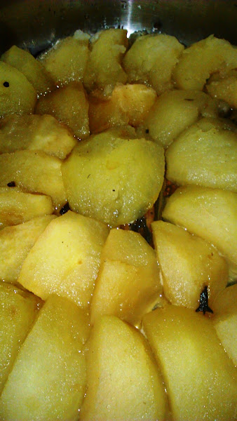 Partimos las manzanas en cuartos, las pelamos y les quitamos el corazón (para que no se vayan poniendo feas, las que ya estén listas las introducimos en un recipiente con agua y un poco de zumo de limón, así evitamos que se oxiden).
