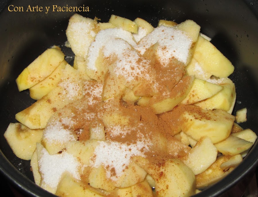 Agregamos a la olla las manzanas troceadas, azúcar, canela y el agua del propio reciente que hemos usado,