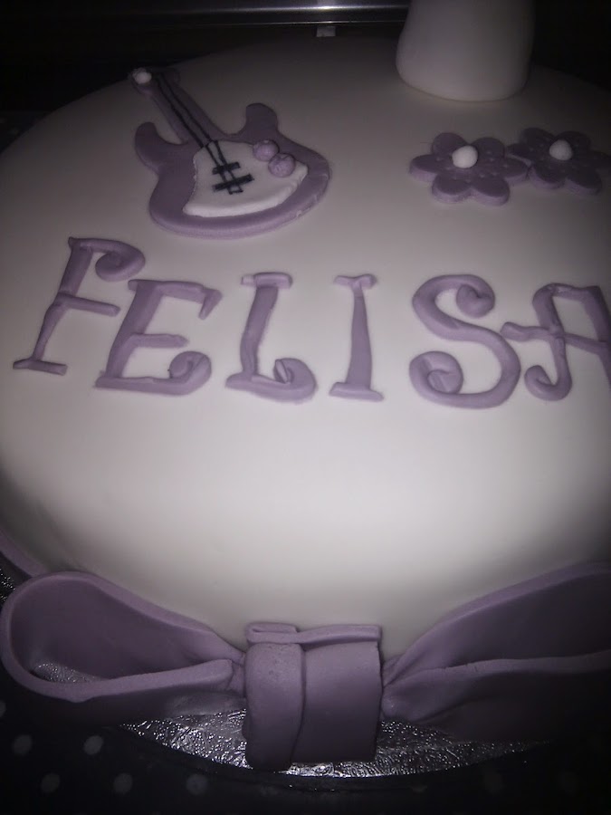 Como la tarta tenía que estar ambientada en la serie de televisión, utilizamos los colores blanco y lila... y ese toque rockero con la guitarra y el toque tierno de las flores y el gran lazo que rodeaba la tarta.