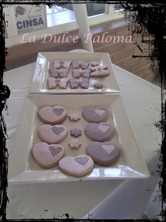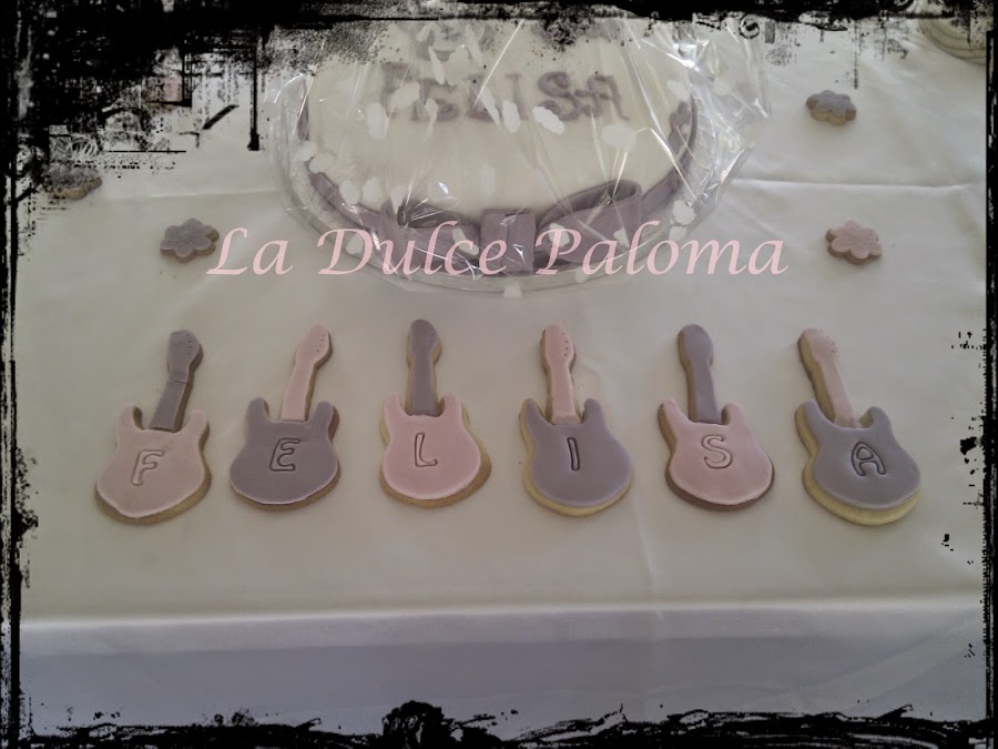 Natalia, la mamá de Felisa, nos pidió también galletas. Así que distribuimos las galletas por la mesa de distintas maneras. Unas con forma de guitarra que forman el nombre de la niña. Otras flores distribuidas por el mantel y otras con forma de corazón y mariposa en bandeja.