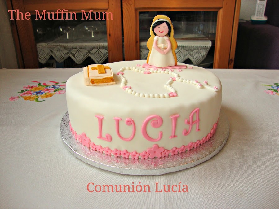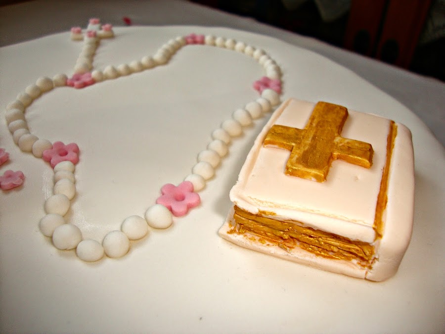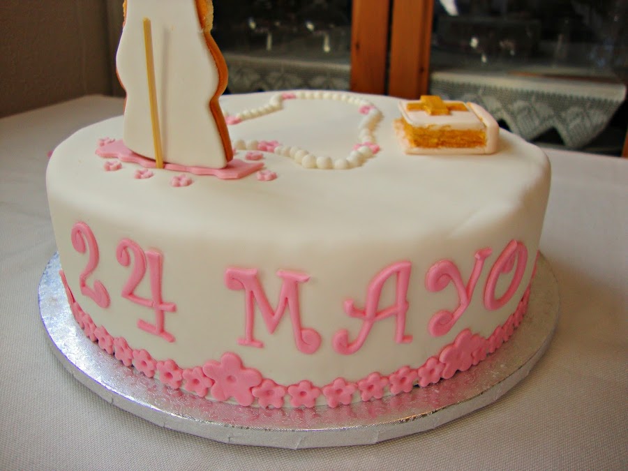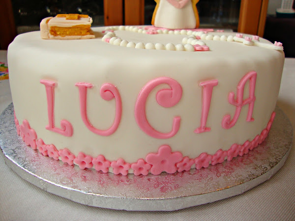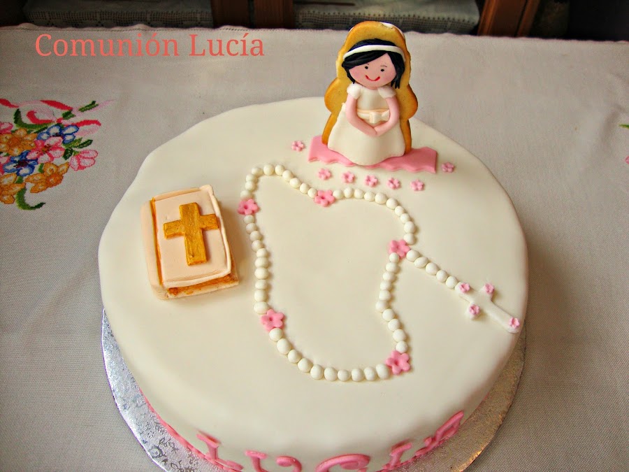 Esta tarta para la comunión de Lucía la pidieron en tonos rosas y blancos y con bastantes detalles religiosos, pero con florecitas para que no fuese demasiado seria, el resultado a mi personalmente me encantó.