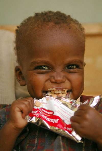 Porque 1 ??? es lo que cuestan 3 Plumpy´nut, que es un alimento terapéutico en un paquete que contiene 92 gr. con mantequilla de cacahuete, azúcar, grasas vegetales y leche en polvo, enriquecido con vitaminas y minerales, que trata la malnutrición aguda y devuelve la energía a los niños que lo toman. Si lo toman 3 veces al día les permite engordar 1kg a la semana.