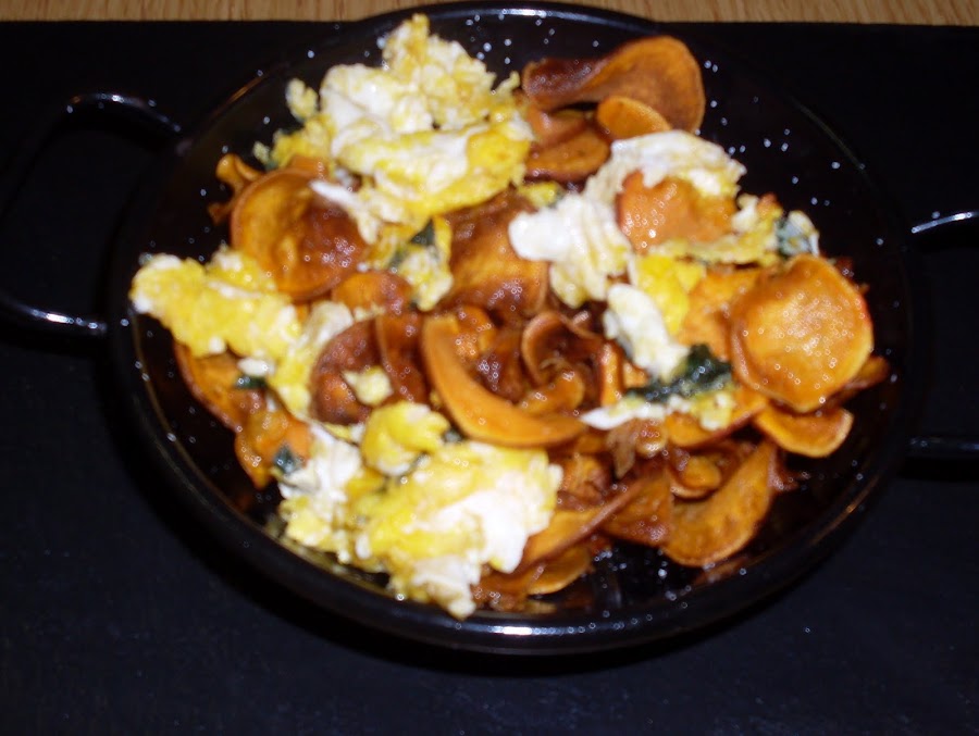 El clásico de huevos con chorizo al que nuestro amigos del blog Evasiones culinarias, le han dado la vuelta, haciendo una presentación de lo más apetecible..
