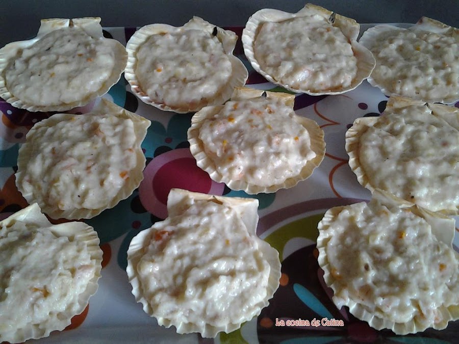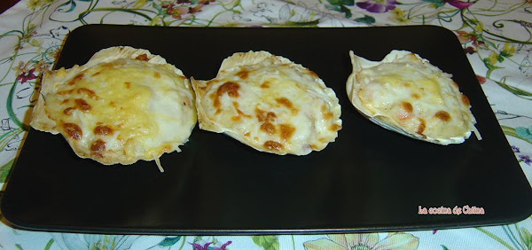 Rellenamos las conchas con esta masa, espolvoreamos con queso rallado y las gratinamos en el horno.