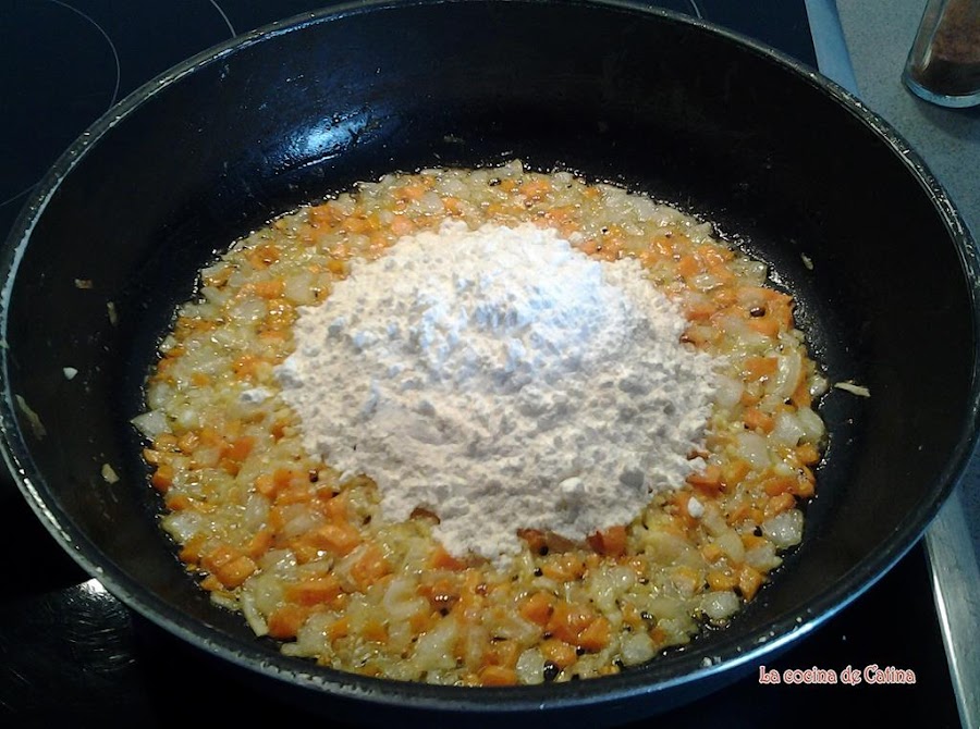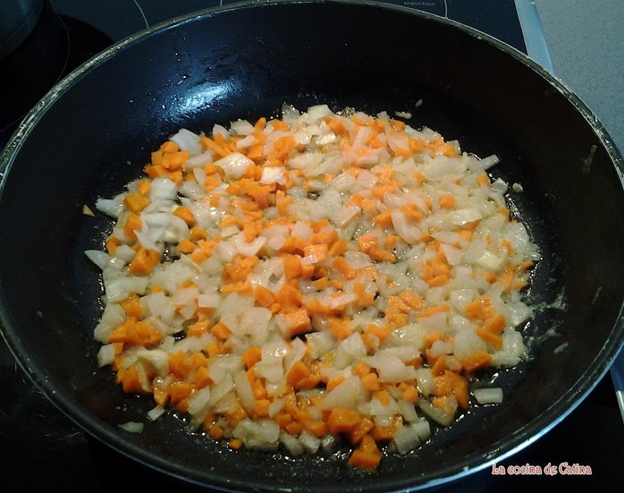 En una sartén ponemos la mantequilla a calentar, mientras picamos la cebolla, la zanahoria y la chalote en trozos pequeños, una vez picados los freímos.