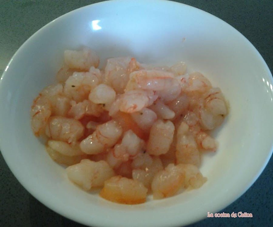 Cortamos las gambas a trocitos y le damos unas vueltas en una sartén con un poco de aceite, las incorporamos a la mezcla anterior junto a la merluza desmenuzada. Mezclamos todo bien y dejamos cocer uno o dos minutos par a que mezclen bien los sabores.