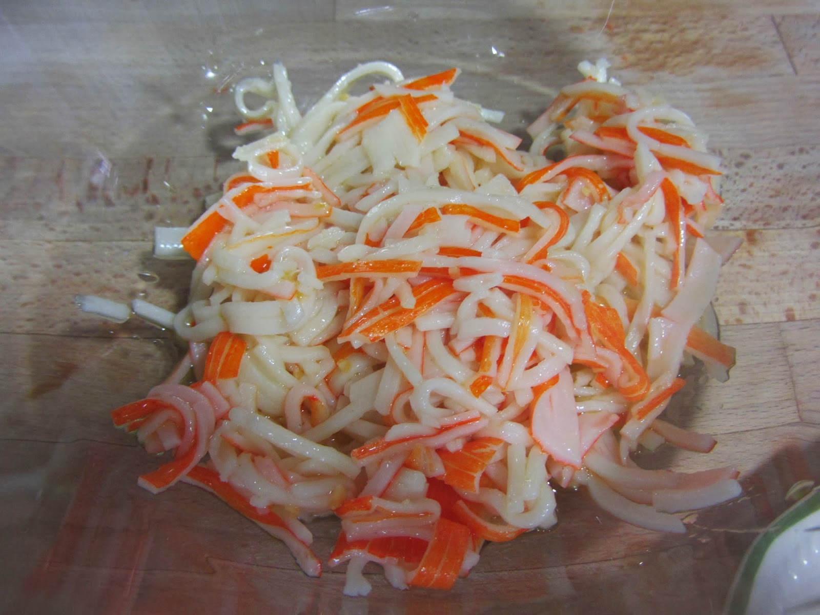 Picamos el surimi de forma que queden hilos. A mano, lo haremos cortando rodajas muy finitas. Y, con Thermomix, pondremos los palitos en el vaso, y programamos 4 segundos, velocidad 4 con giro a la izquierda, comprobando si nos ha quedado un trozo más grande (Con el giro a la izquierda, conseguimos que no se nos pique demasiado, sino que se "haga hilos").