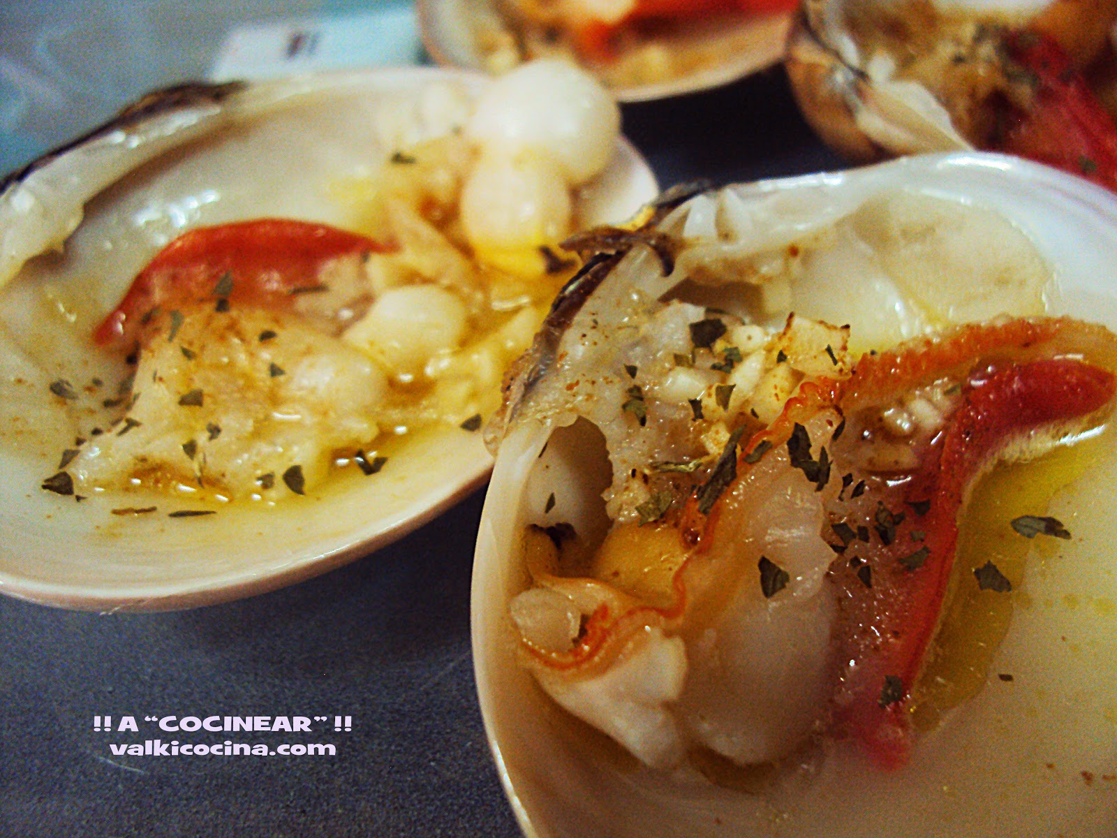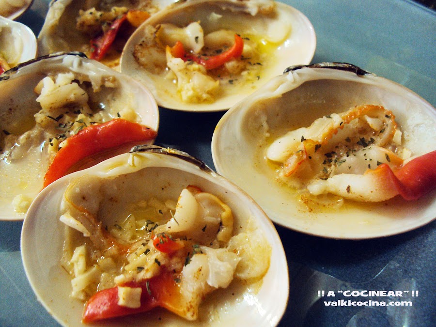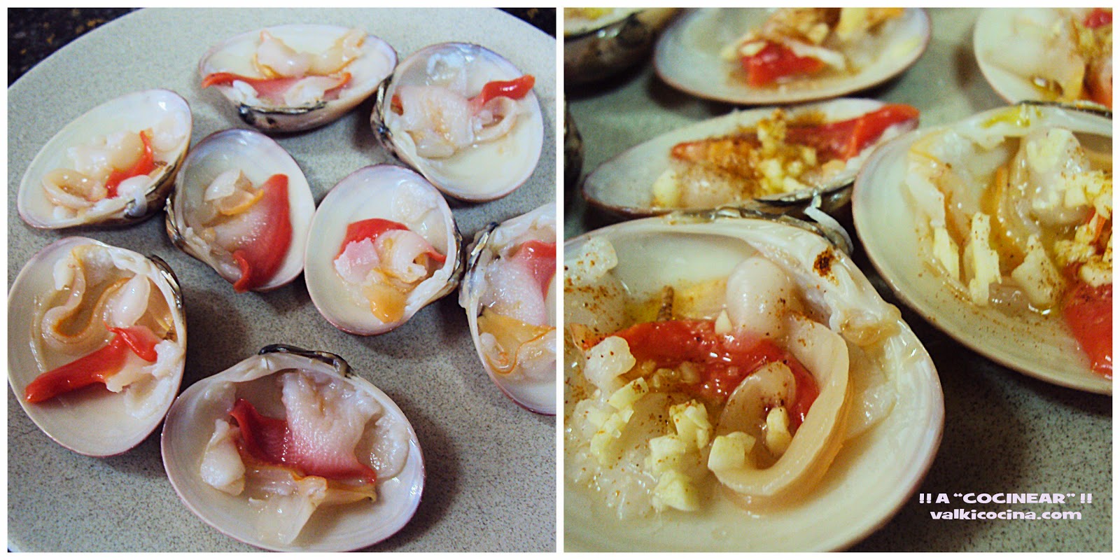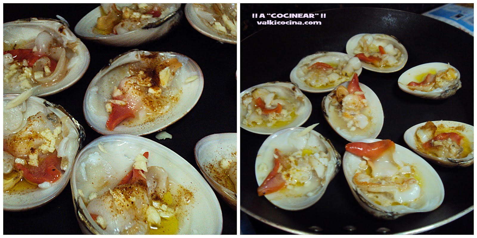 Una vez tengamos limpias las conchas como se explica en el enlace y video, les ponemos a cada una un poco de sal, ajo picadito, espolvoreamos pimentón y añadimos un chorrito de aceite.