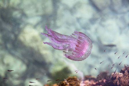 No son ni mucho menos las más perversas, aunque el roce con ella resulta bastante urticante. Es una criatura provista de un sombrero, también llamado umbrela de unos 20 cmts., con cuatro tentáculos orales y 16 marginales que pueden alcanzar los dos metros de longitud.