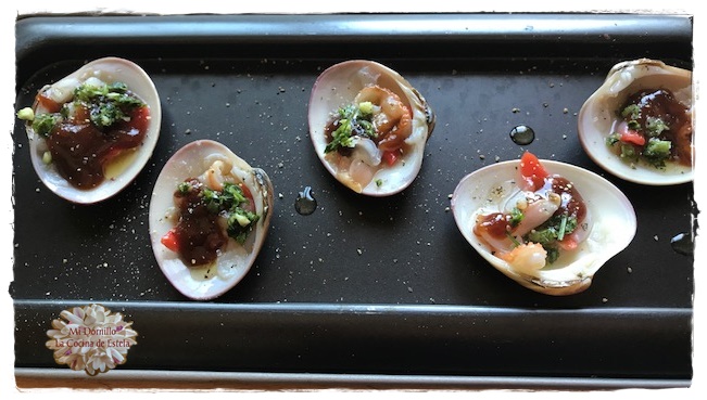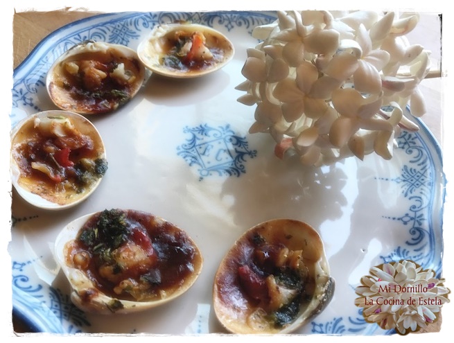 Una vez que estan limpia las sazonamos con sal y pimienta y las ponemos en una bandeja de horno, ponemos la picada de ajo y perejil, un poco de tomate casero con un poco de guindilla si queremos que tengan un toque picante. Y un chorrito de aceite.
