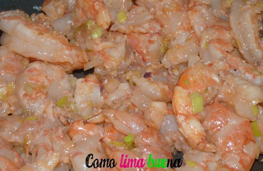 Cuando el ajo y la cebolla ya están dorados sumamos los langostinos y los salteamos apenas unos minutos.