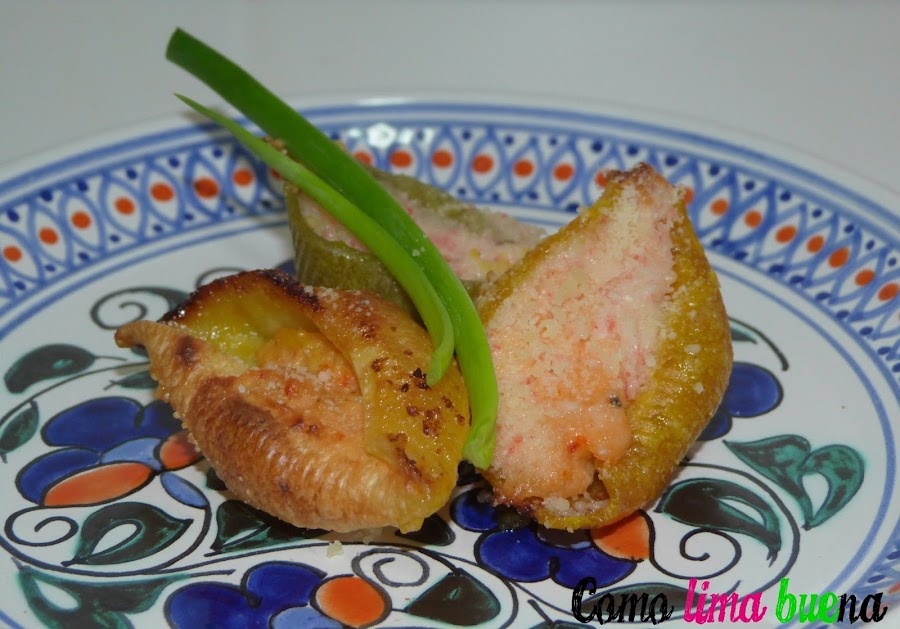 Por otro lado, tomamos la pasta precocida y la rellenamos con paciencia y dedicación. Una cucharadita dentro de cada caracola. Al finalizar ponemos la pasta en un recipiente apto horno (por ejemplo una Pirex) y la cubrimos con la crema y queso rallado.