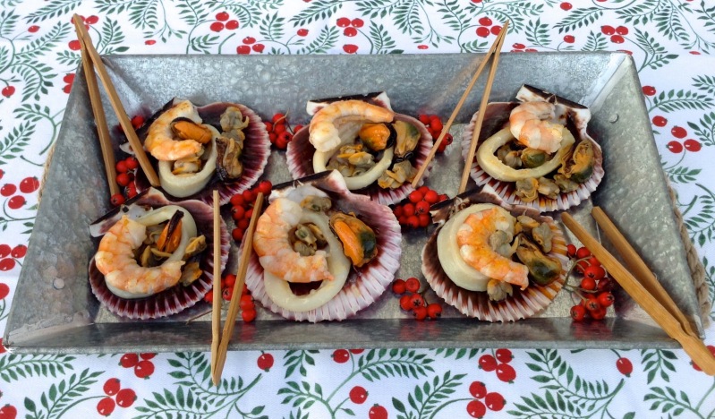 Montar las conchitas distribuyendo en cada una de ellas unos pocos berberechos, mejillones, una anilla de calamar y un langostino.