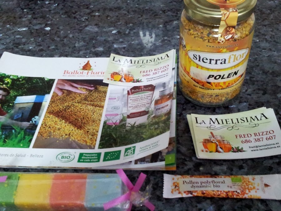 Este es el regalo que me mandaron El catalogo, un tarro de polen, jabones con la palabra miel, monodosis de polen y unas tarjetas con su numero de teléfono y su pagina web.