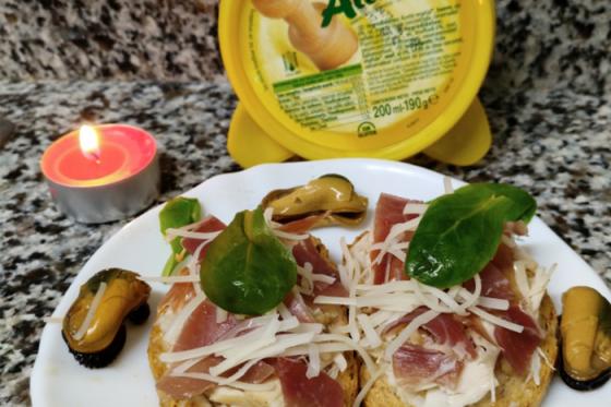Mi pinchoví consiste en una tostita integral con Allioli Choví en la base y trocitos de pollo, jamón serrano y queso rallado. Para decorar, mejillones y unas hojas de canónigos alrededor del plato, además de una hojita en cada tosta ¡Un pinchoví con un sabor delicioso!