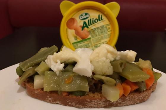 Se compone de pan de molde sin corteza, patatas deluxe. Revueltito de setas y ajitos tiernos…queso de loncha tierno troceado. Un toquecito de kétchup de Choví… y el Allioli Choví, mezclado en las patatas y el revuelto.