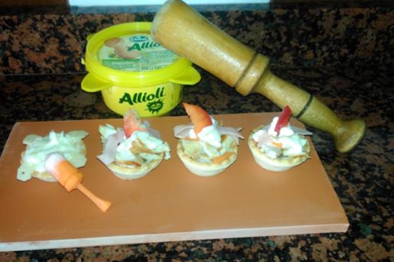 Ponemos el huevo de codorniz. Cubrimos con la salsa de allioli y decoramos con el pollo, la zanahoria, jamón de york y el pimiento rojo. Acompañamos con los bocados Choví una tartaleta llena de alioli Choví como salsa adicional.