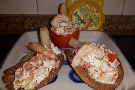 Luego, en un plato, mezclamos el tomate, el queso fresco y el surimi relleno de salmón hecho trozos finos, así como también añadimos maíz y el alioli, moviendo hasta que la mezcla se vea unida. Aliñamos con un poco de sal y pimienta. A continuación, rellenamos las bases de pan o de tomate y ponemos en la parte superior un buen langostino pelado y un espárrago blanco, especiando con albahaca para realzar el sabor. Un pincho delicioso apto para celiacos.