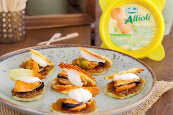 Tan solo queda montar el pincho colocando una rodaja de patata, sobre ella una cama de cebolla caramelizada, un mejillón, una cucharadita de allioli Choví y cerramos la concha con otra lámina de patata. Nota: Se puede ahorrar tiempo y trabajo usando mejillones en conserva y cebolla caramelizada envasada.