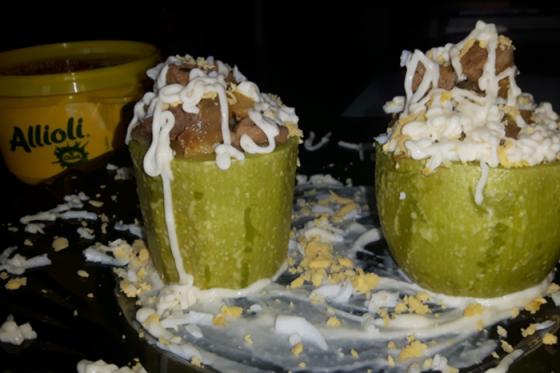 Una vez realizadas las elaboraciones comenzamos con el emplatado: en primer lugar untamos la base del plato con bastante alioli Choví, para dar sabor a la mezcla al partirse y dar la sensación de “nevado”. Si es posible utilizamos un plato oscuro para favorecer la vistosidad. Colocamos los trozos de calabacín previamente cocidos sobre la superficie del plato, y rellenamos su interior con la mezcla de magra de cerdo ibérico, calabacín, cebolla y huevo.