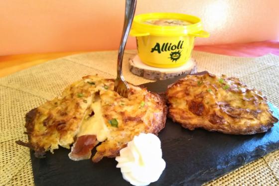 Rallamos las patatas y damos un golpe de calor en el microondas. Añadimos mantequilla derretida, huevos, cebolla, perejil, sal y pimienta. Elaboramos una pasta. En bandeja de horno colocamos de forma redondeada una capa, encima jamón y queso y cubrir con otra capa. Hornear a 200 grados, 20 minutos. Emplatamos y acompañamos de Allioli Choví.