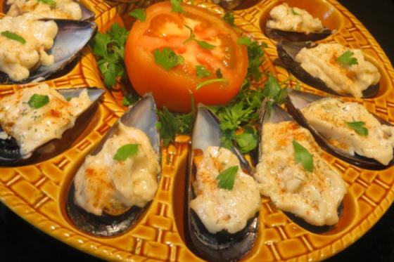 Pinchoví de mejillones y cebolla caramelizada en concha de patata