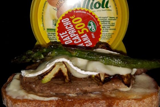 Comenzamos con una rebanada de pan tipo rústico, que tostamos previamente hasta conseguir un toque crujiente. A continuación, untamos con una buena capa de Alioli Choví, que dará un sabor final intenso. Sobre este pincho depositamos una loncha de presa ibérica previamente pasada por la plancha (aliñada con sal, pimienta y pimentón ahumado). Acto seguido, ponemos dos trocitos de calabacín (blanco o verde al gusto) pasados igualmente por la planta y aliñados con un poco de pimienta. Por encima, una loncha de queso Brie que fundiremos con el soplete ligeramente. Como colofón, y ya que estamos en plena época, un buen espárrago triguero a la plancha que añadirá diferentes matices a nuestro pincho. Por supuesto, le damos un pequeño toque de escamas de sal (sin excederse) para que el pincho sea un maridaje perfecto para un buen vino tinto y realce así su sabor.