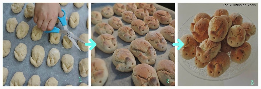 Los pasos son sencillos: preparáis la masa según la receta que nos muestra Mom Always Finds Out. Hacéis pequeñas bolitas y después con unas tijeras hacéis dos cortes para formar las orejas. Tenéis que redondear un poco las orejas porque si no quedan picudas y no parecen conejos. Por último, marcáis los ojos con un palillo u otro objeto punzante o incluso poniedo bolitas de pimienta u otro grano. Metéis al horno unos 10 minutos a 180 grados.
