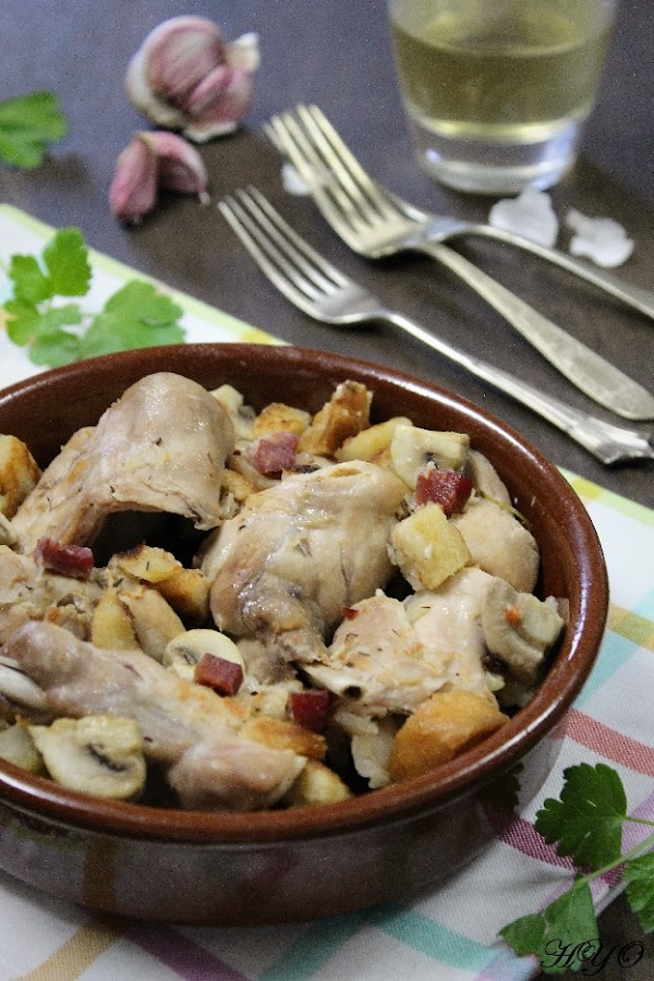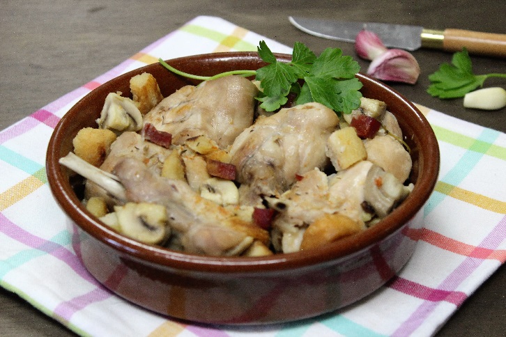 6. Pasado el tiempo de cocción del conejo lo retiramos del fuego. En una fuente colocamos los trozos de conejo. Añadimos los champiñones salteados a la salsa que haya quedado en la cacerola y la vertemos sobre el conejo (si es mucha ponemos solo una parte). Para finalizar, agregamos a la fuente los picatostes, distribuyéndolos por toda la superficie.