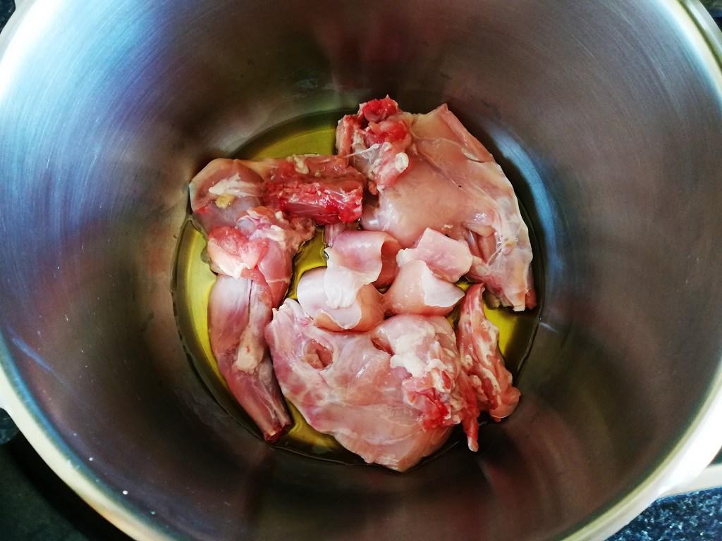 Troceamos el conejo (viene troceado y limpio ya en bandejas), sazonamos y reservamos. En una olla rápida vertemos un chorro de aceite de oliva y doramos el conejo por todas sus caras, reservamos.