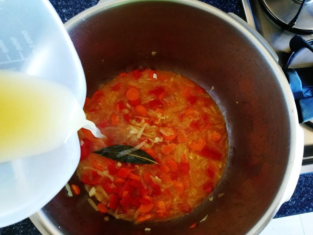 Limpiamos y troceamos finamente la cebolla y los ajos, reservamos. Limpiamos y pelamos el pimiento rojo, troceamos en dados no muy grandes, reservamos. Limpiamos las zanahorias y picamos en rodajas finas, reservamos.