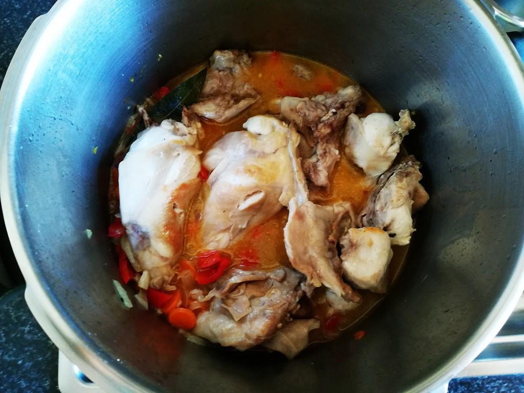 La receta original lleva pollo, pero me pareció interesante hacerla con conejo y la verdad es que acerté.
