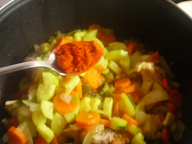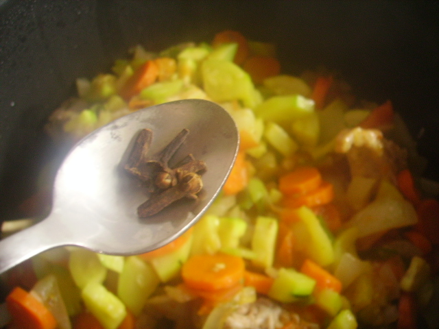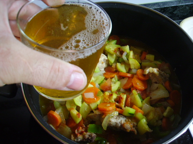 6.- Ponemos los clavos de olor, el pimentón, el vaso de cerveza y cubrimos con agua.
