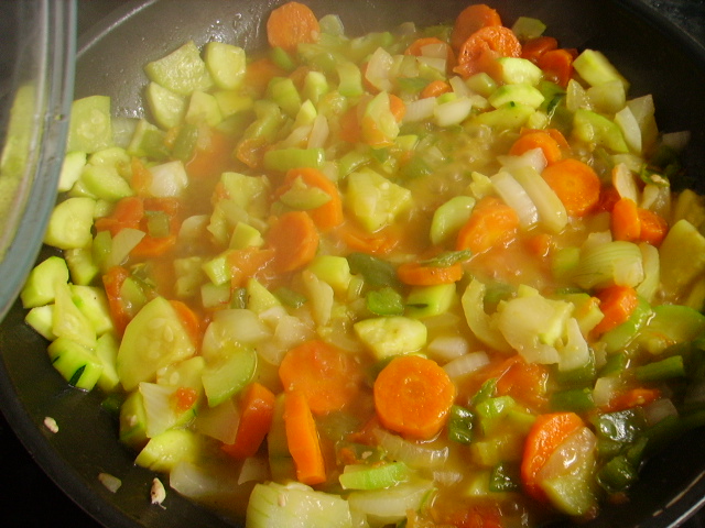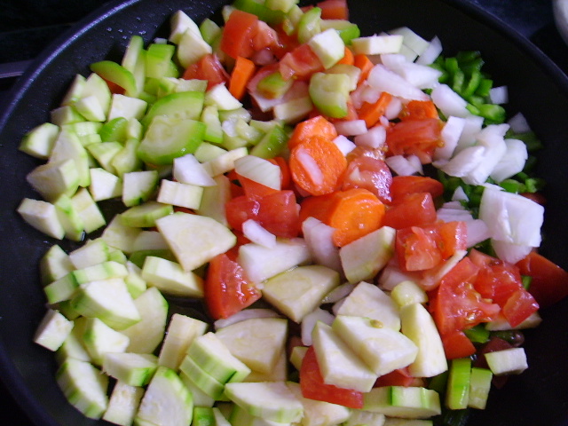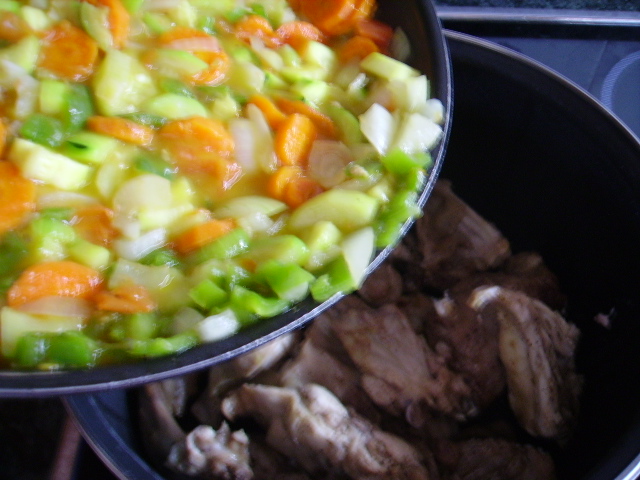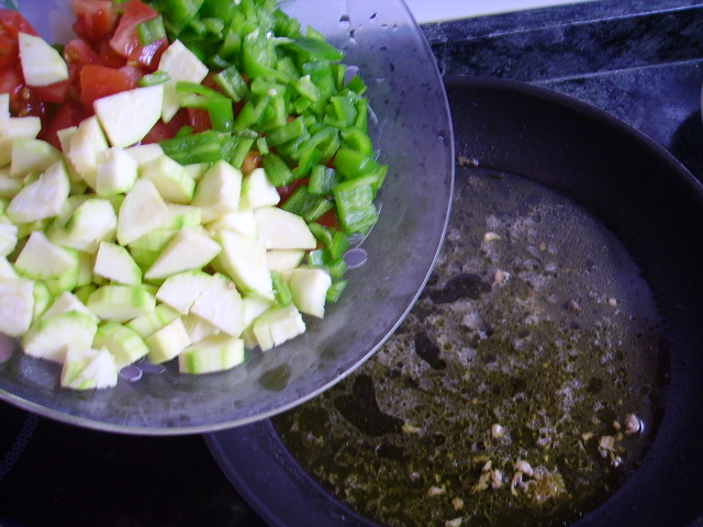 4.- En el mismo aceite donde hemos dorado el conejo, pochamos la verdura.