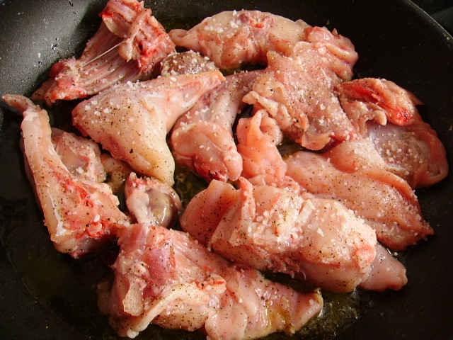 1.- Troceamos el conejo, lo salpimentamos y doramos en una sartén con un poco de aceite de oliva virgen extra.