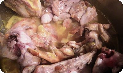 En una cacerola pon aceite abundante a calentar y agrega el conejo. Deja que se dore en el aceite a fuego lento. Pon sal y pimienta, remueve.