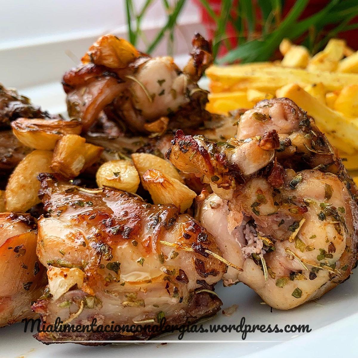 Troceamos el conejo. Lo embadurnamos con las especias, el ajo troceado por la mitad y un chorrito de aceite. Reservamos en la nevera mínimo 30 minutos. Yo lo he tenido unas 2 horas.