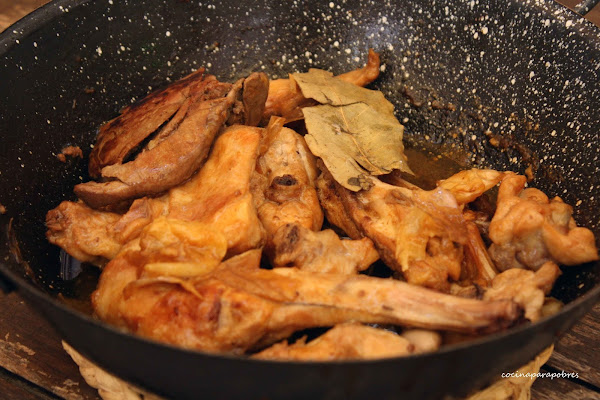 Una vez tostado los apartamos y en esa misma sartén a fuego fuerte doramos la carne conejo salpimentada, junto a las hojas de laurel.