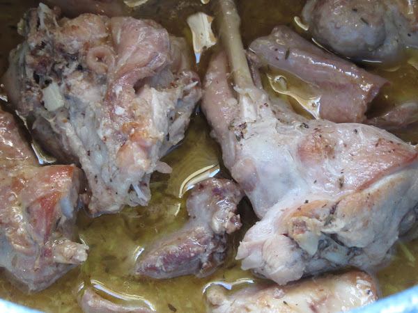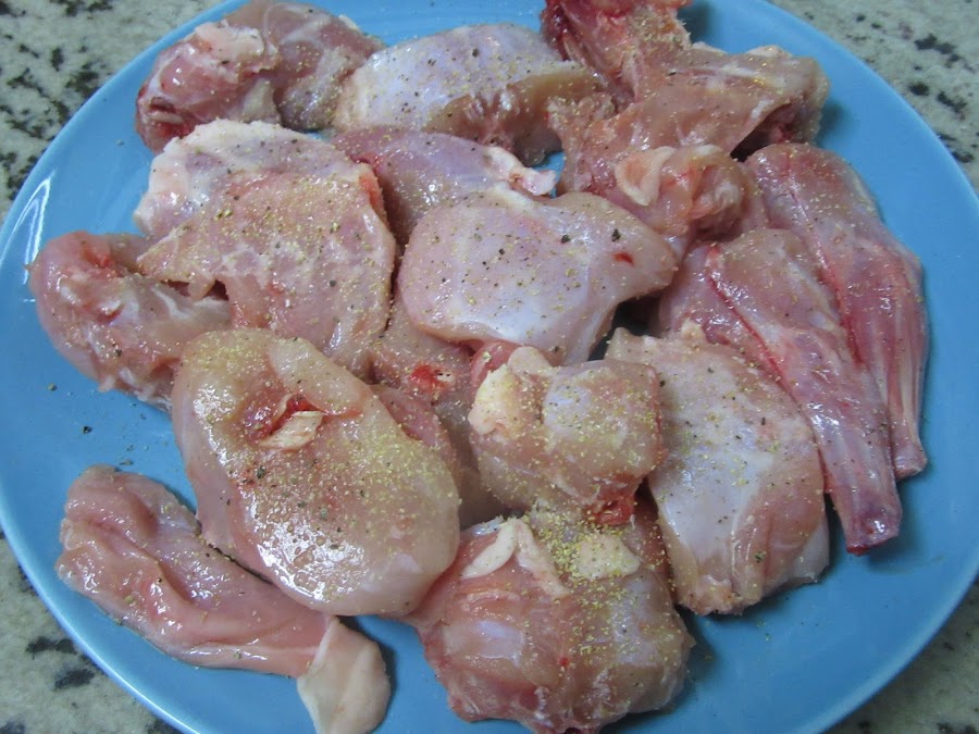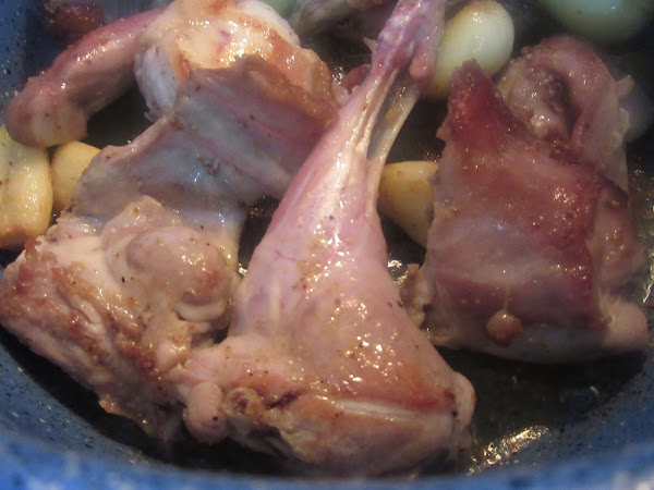 1- Salpimentar el conejo y sazonar con ajo en polvo. Echar aceite y los ajos enteros a la cubeta y en menú freir ir dorándolos. Cuando ya quieran coger color, añadir el conejo troceado y dorar el conjunto hasta que tome color.