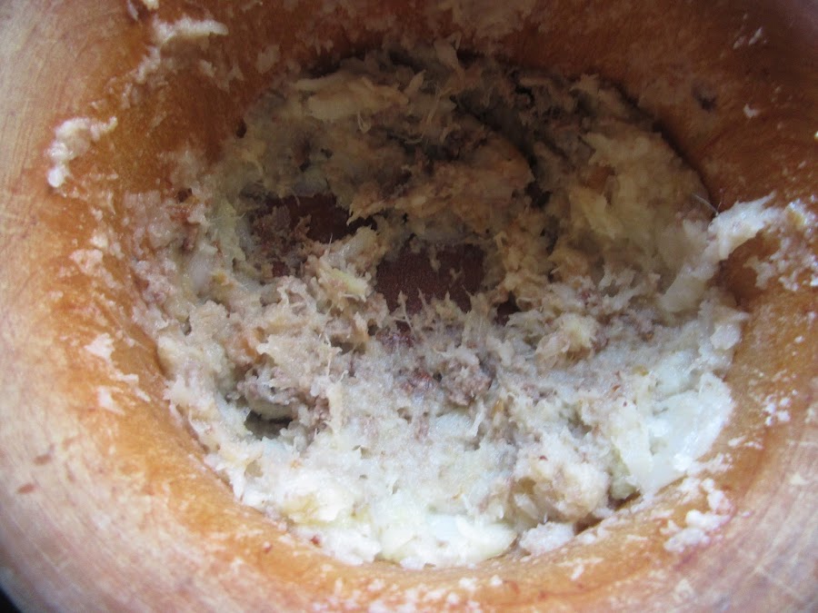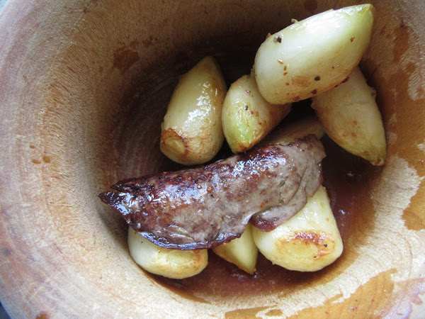 2- Sacar los ajos sofritos y majar en el mortero junto al hígado del conejo y un poco de sal. Añadir el vino al mortero y volcar en la cubeta. Evaporar 3-4 minutos el alcohol destapado.
