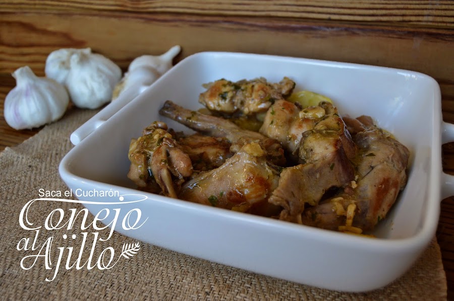 Aparte en una cazuela ancha con un buen chorro de aceite de oliva doramos los ajos laminados a fuego medio junto con la punta de la guindilla. Cuando empiecen a dorar, añadimos el conejo troceado y salpimentado. Dejamos que el conejo dore bien y coja un buen color.