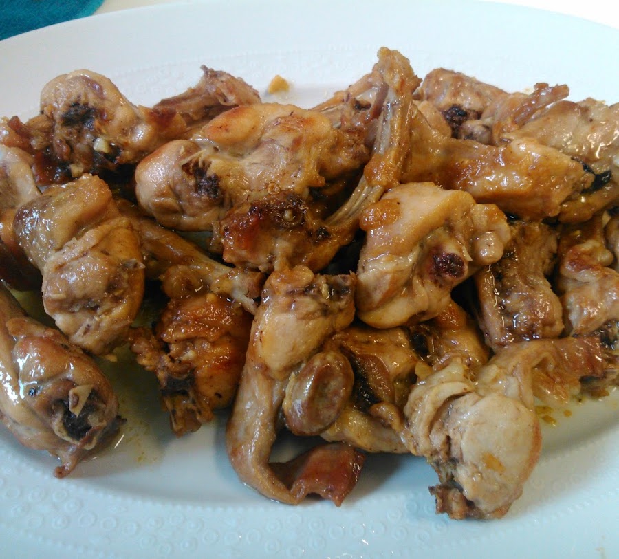 Se pone el aceite en una sartén. El conejo se corta en trozos pequeños se pone la sal y se va friendo cuando este dorado se pasa a una cazuela, donde se habrán puesto el ajo picado con un poco de aceite de freír, se rehoga todo un poco y cuando los ajos empiezan a tomar color se añade la copa de vino blanco se deja hervir hasta que el vino se consuma, (el conejo tiene que estar tierno) si es necesario se añade un poco de agua para que termine de hacerse.