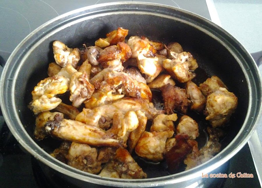Cortar el conejo en trozos pequeños y sazonar. En una sartén con aceite de oliva, freír los dientes de ajo sin pelar y añadir el conejo.