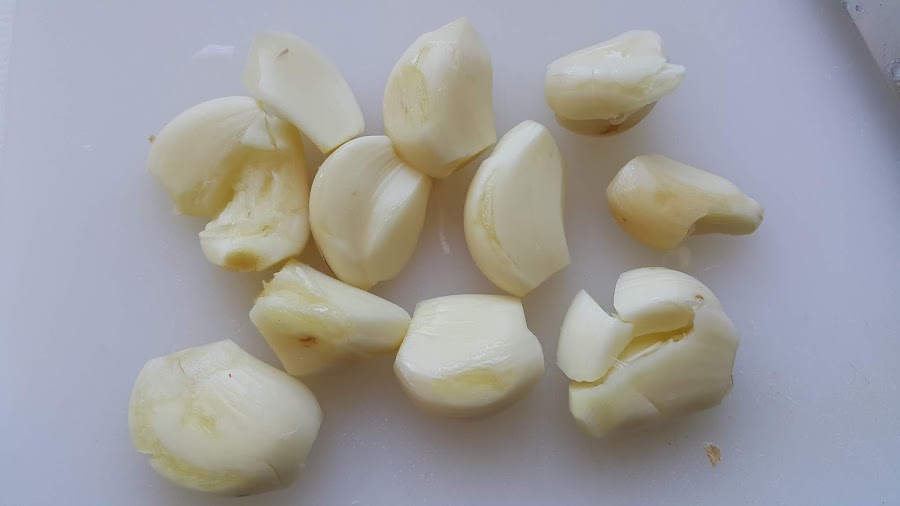 Empezamos preparando los ajos. Para ello los pelamos y aplastamos un poco ayudándonos con la hoja del cuchillo.