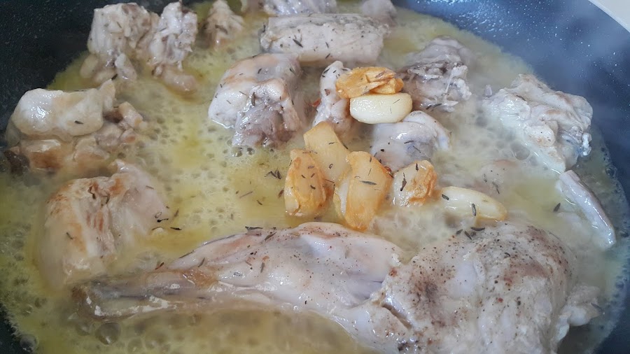 Retiramos los ajos una vez dorados y marcamos el conejo a fuego medio alto con el aceite que habremos infusionado.