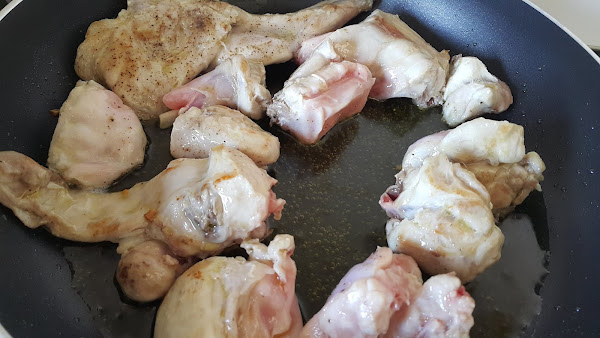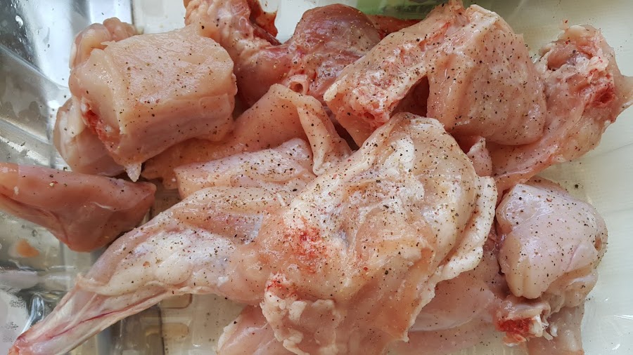 Partimos el conejo en porciones, en el caso de que lo hayamos comprado entero, y le añadimos pimienta.