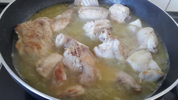 Añadimos el 1/2 vaso de vino blanco y otro medio de agua y dejamos cocinar a fuego medio durante unos 10 minutos.