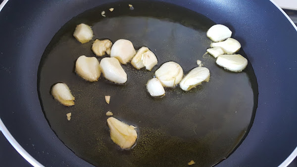 Cubrimos el fondo de una sartén con aceite de oliva y añadimos los ajos. Los dejamos a fuego bajo mientras se van dorando y van dejando su sabor en el aceite. Hay que vigilar constantemente los ajos ya que se pueden quemar con facilidad y amargarían el sabor.